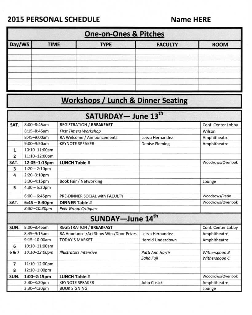 B&W Word doc.-2015 Personal Schedule Published June 5, 2015 at 2543 × 3175 in UP!–NJSCBWI 2015 Conference Personal Schedule Template for Download!